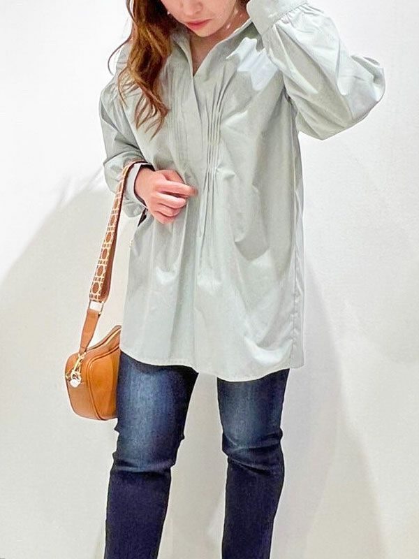 フロントのピンタックデザインと、袖にボリュームのあるデザインがエレガントに見せてくれます。