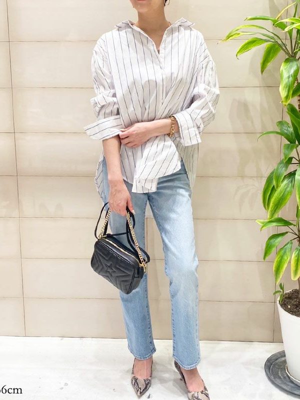ホワイトベースのストライプシャツに、さわやかさを感じるサックスブルーのデニムでコーディネート。