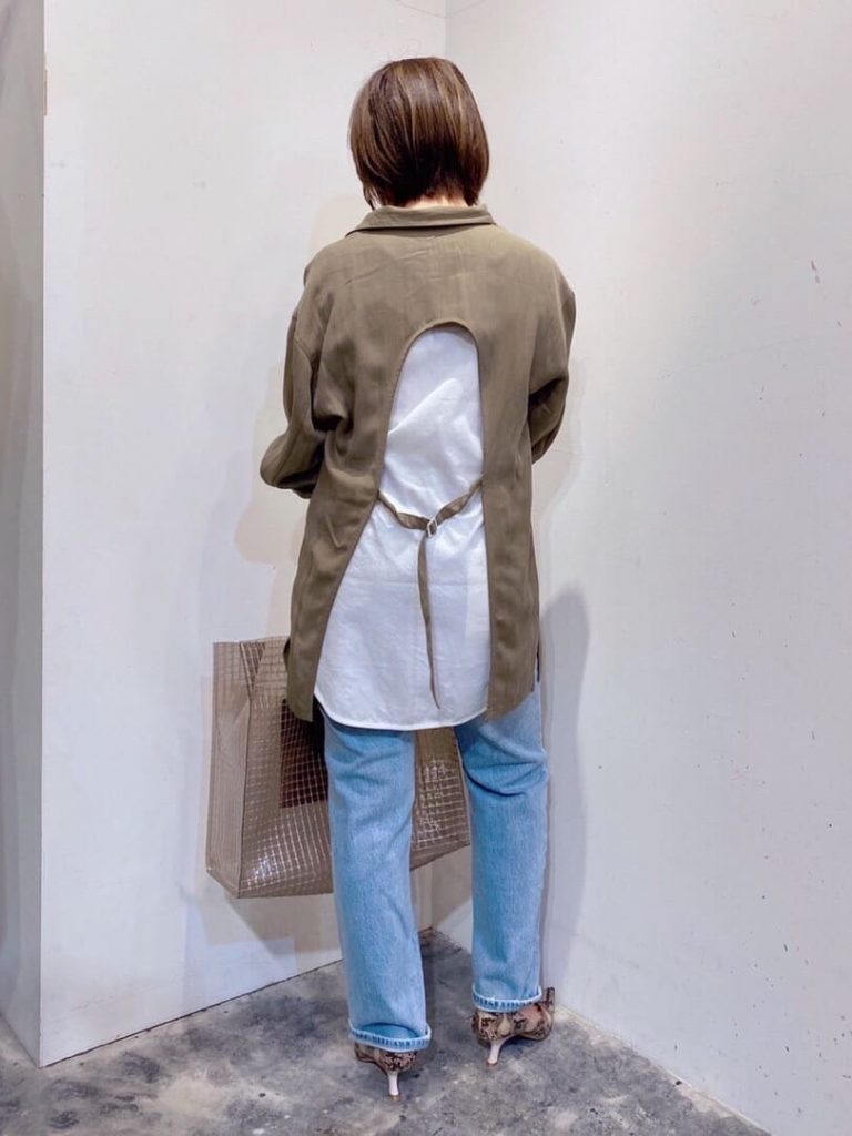 ワーク系なイメージがあるカーキを、インナーのホワイトとライトブルーのデニムパンツで明るめな印象にします。