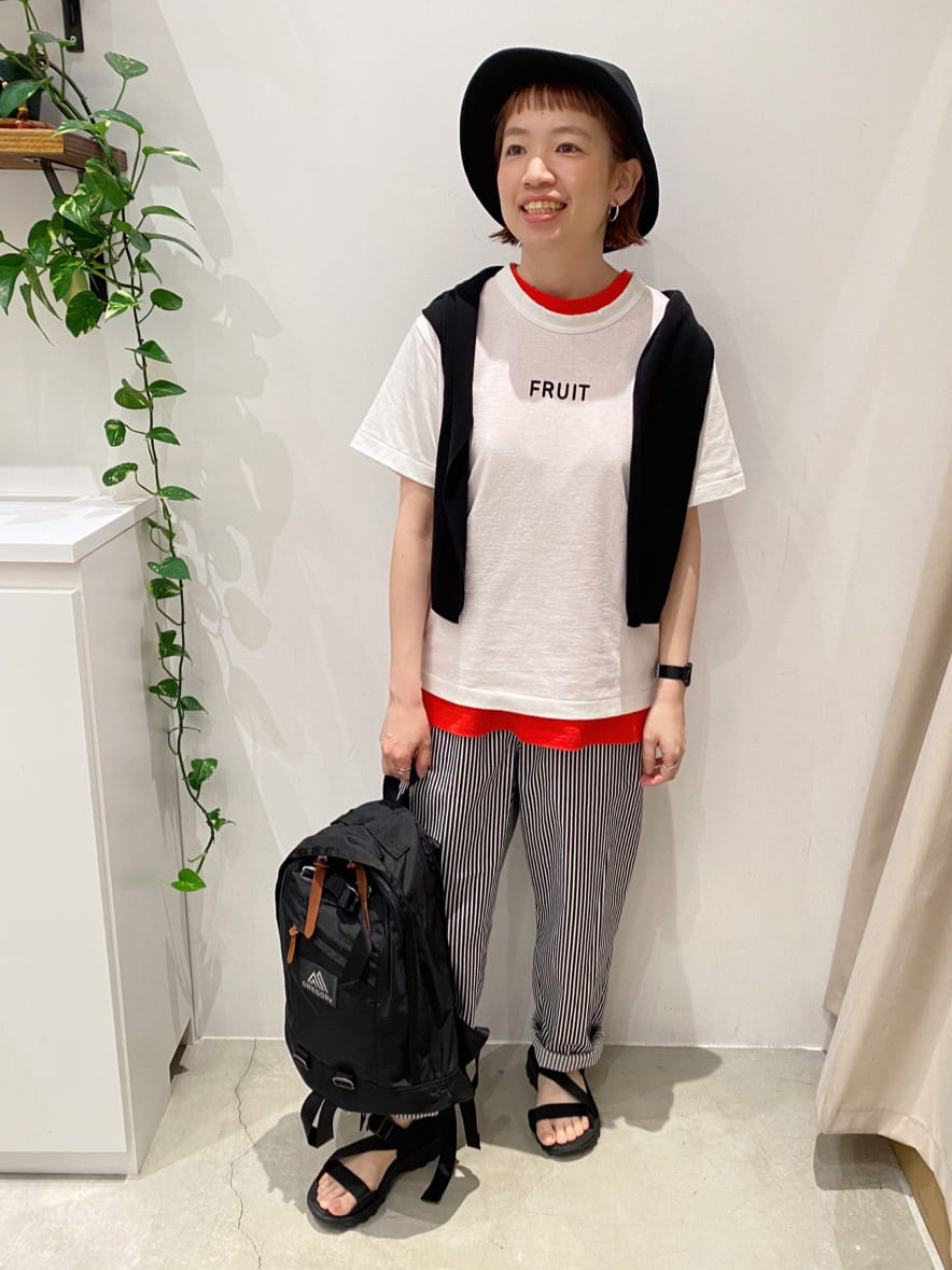 ロゴTシャツのインナーにレッドをチラ見せしているのも、地味見えしないポイントです。