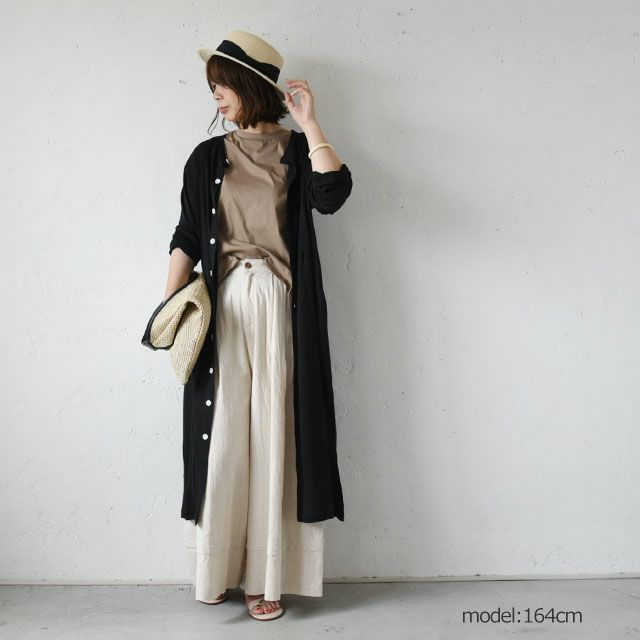ワイドパンツに合わせたり、リネン素材のカーディガンを選んだりすると大人のリラックススタイルの出来上がり。