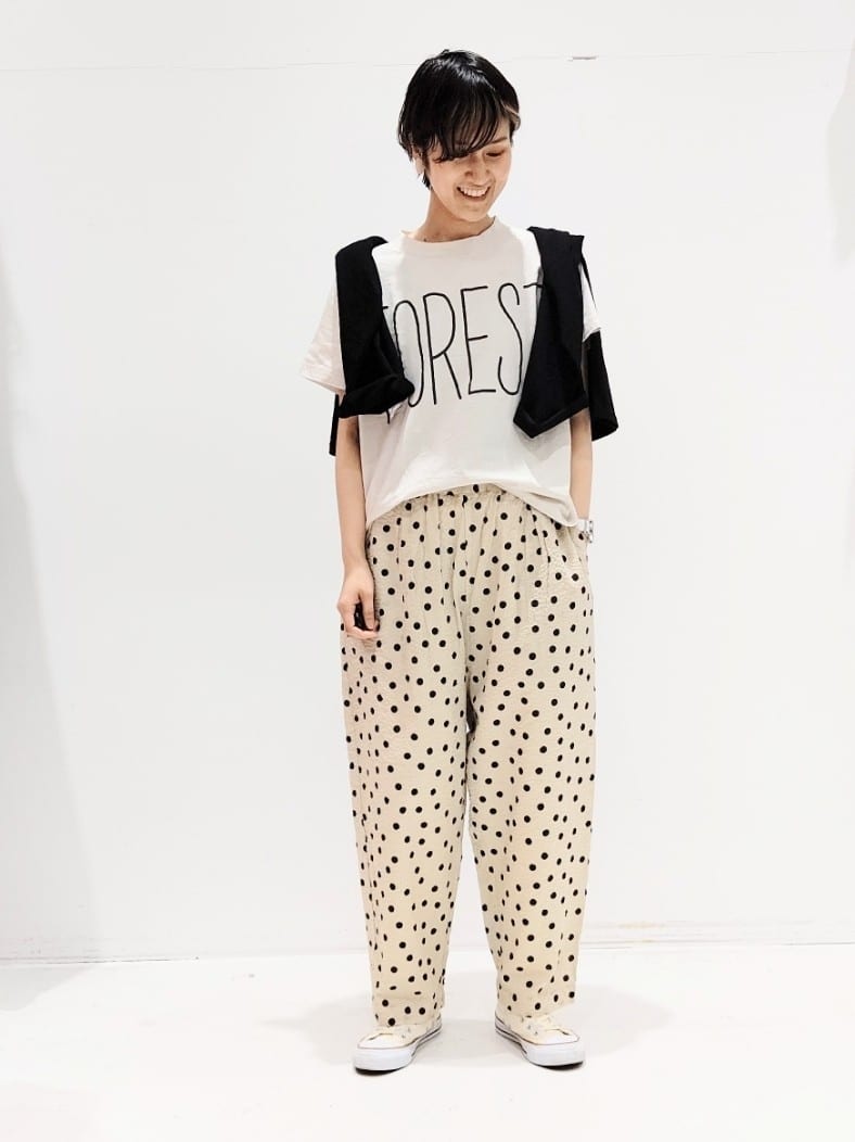 ゆったりシルエットとドッドがおしゃれなパンツなので、トップスがホワイトTシャツ+ブラックカーディガンというシンプルなスタイルでも地味になりません。