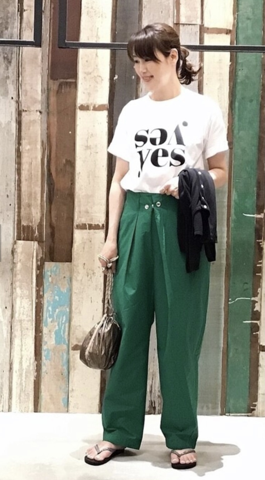 トレンドのグリーンのカラーパンツとインパクトのあるロゴTシャツのコーデ。