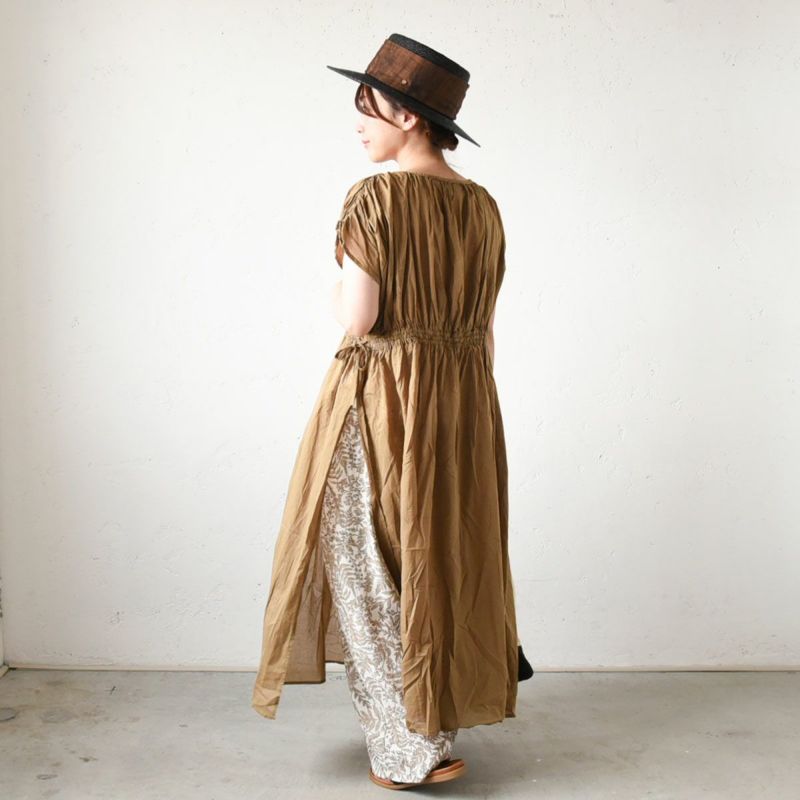 ウエストイージーデザインのリラックスパンツは、夏のリゾートコーデにも役立ってくれる優れもの。ベージュのリーフプリントをあしらったナチュラルなデザインで、大人のオフファッションに自然体な魅力を見せてくれそう。同からーのロングチュニックを着こなしたワントーンスタイルで、爽やかなエクリュコーデを叶えて。黒い帽子で大人レディな雰囲気をアシストして、きれいめなおしゃれのできがあがり。