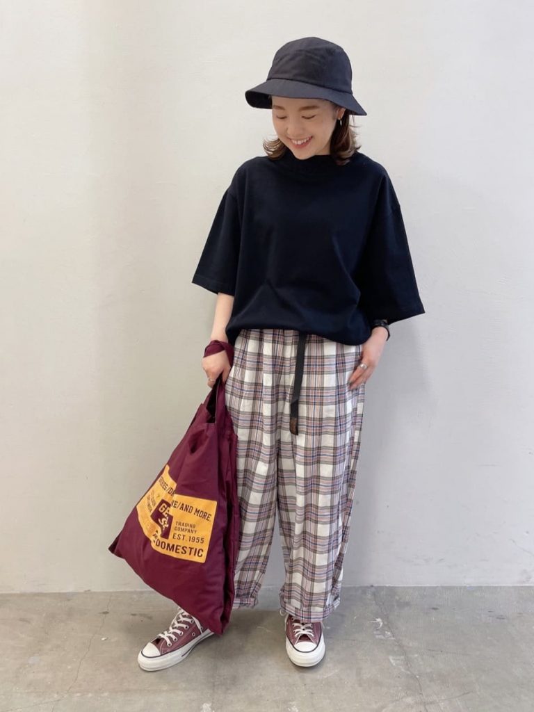 オーバーサイズロゴTシャツ×コットンチェックテーパードパンツコーデ