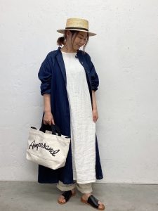 サンダルやストローハットなど、季節感のあるアイテムを合わせるのも、このコーデのポイントです。