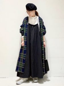 ブラックのキャミワンピにグリーン系のチェック柄を組み合わせ、あえてダークカラーを選ぶのもポイントです。