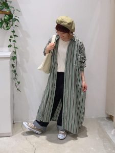 たっぷりの丈感でも、ストライプが縦のラインを作ってくれるので、背が高く細く見えるのもうれしいポイントです。