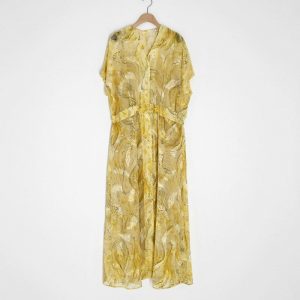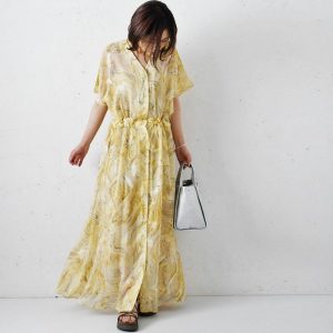イエロー、ベージュと同系色のカラーのワンピース、マーブルのような柄が肌に馴染んでいます。