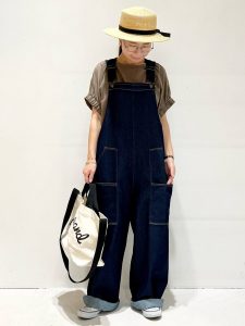 ゆったりとしたオーバーオールは裾をまくってスニーカーを見せればアクセントになりますし、バッグと色を合わせればまとまりのある印象に。