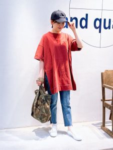 トップスはオーバーサイズの物を合わせるとゆったりとリラックスな雰囲気になるので、ボトムスはジャストサイズの物を合わせてメリハリを付けるのが◎