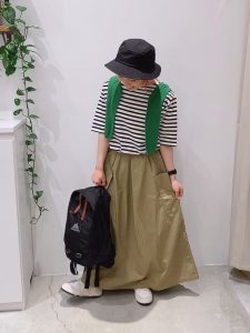 特にキャンプなどの外にいる事の多いお出かけでは、大きなポケットのあるスカートだとちょっとした物を入れられるので◎