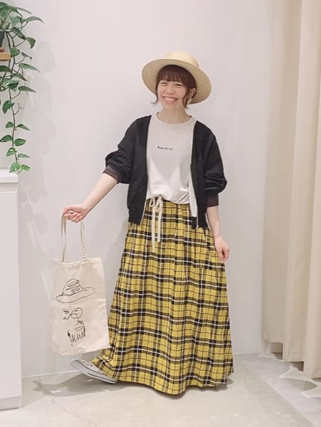 綿麻のチェック柄スカートと白Tにリネンブルゾンを合わせたコーディネートです。