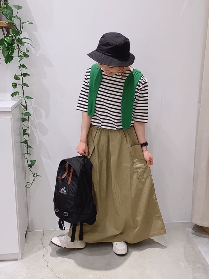 ツイル地のタックスカートにボーダーTシャツを合わせたコーディネートです。