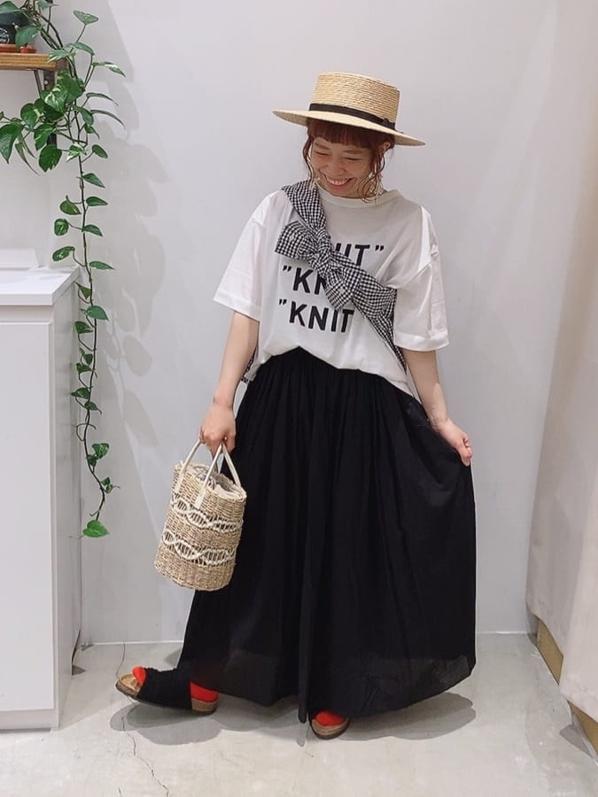 白のロゴTシャツと黒のボイルスカートを組み合わせたカジュアルコーディネートです。