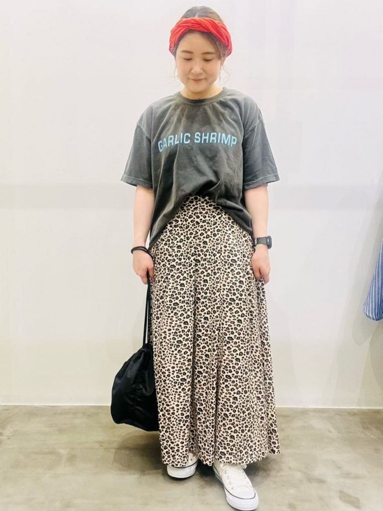 レオパード柄のロングスカートとロゴTシャツを組み合わせたコーディネートです。