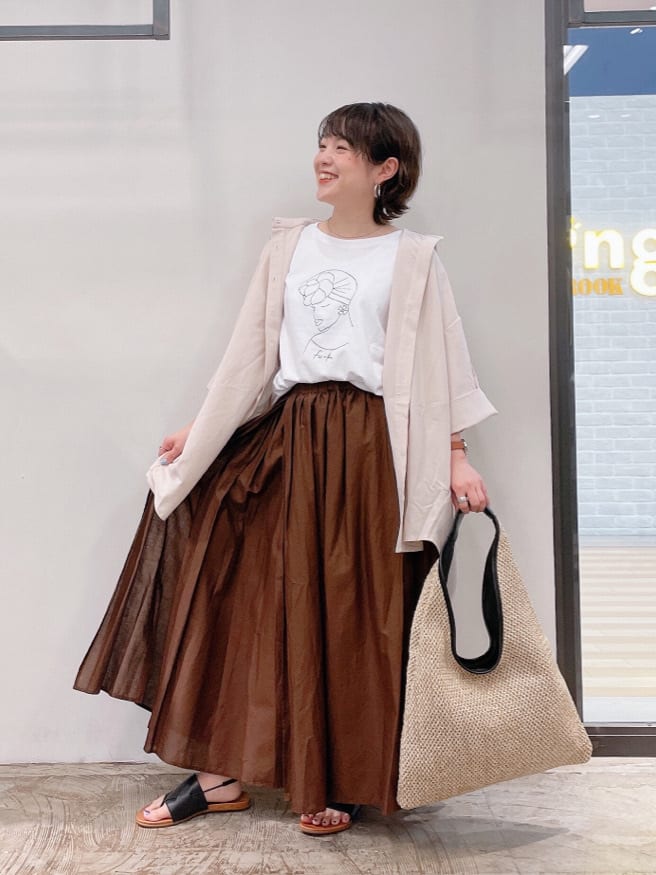 ボリューム感のあるブラウンのロングスカートに白Tとベージュのシャツを合わせたコーディネートです。