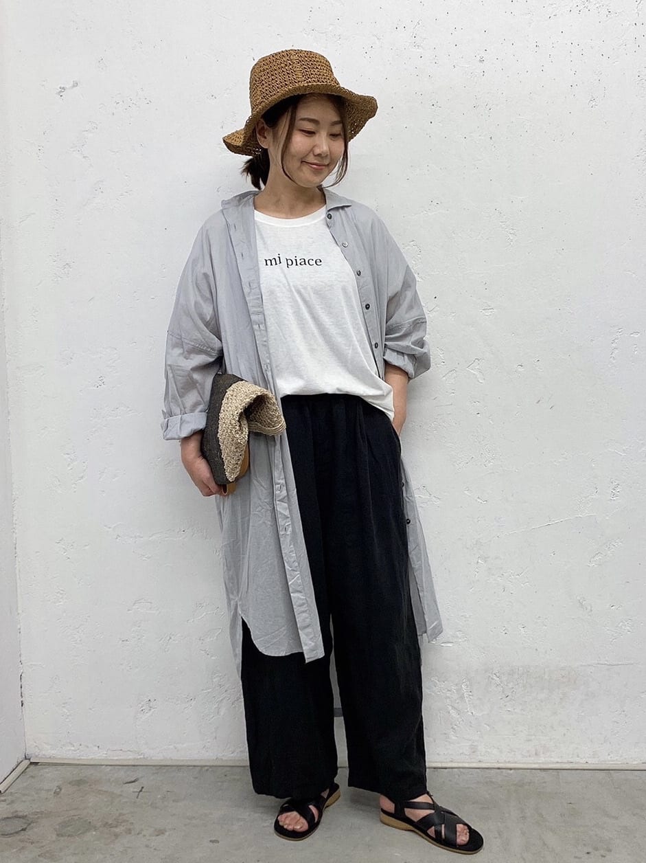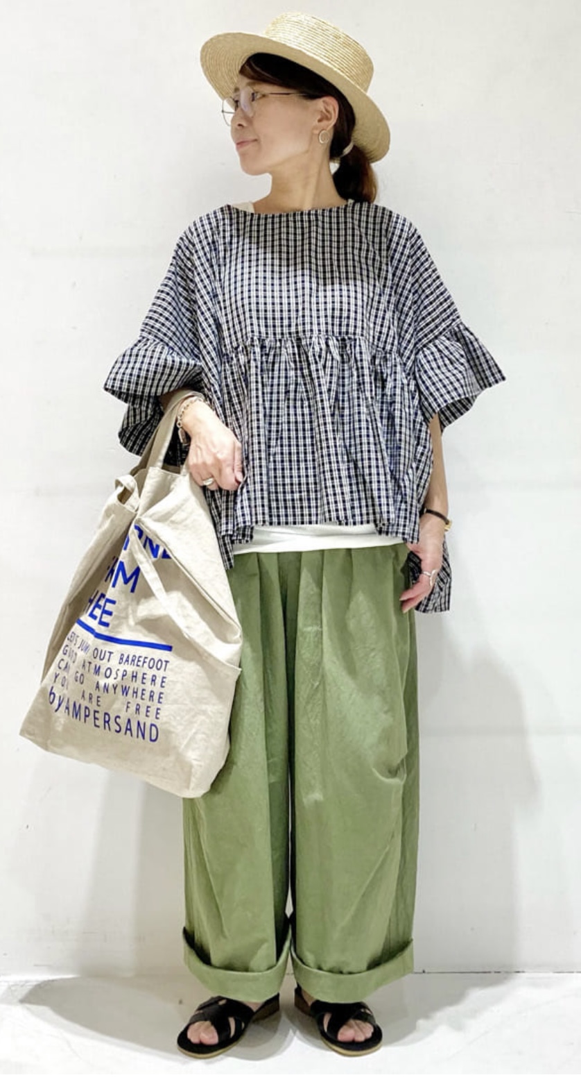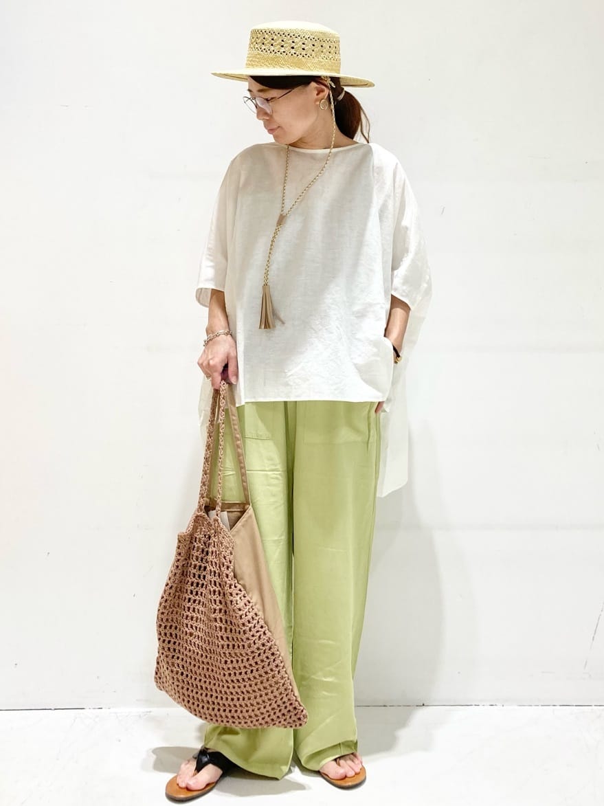 セミワイドでシルエットがきれいなパンツやトングサンダル、小振りなバッグが大人ナチュラル感を出してくれます。