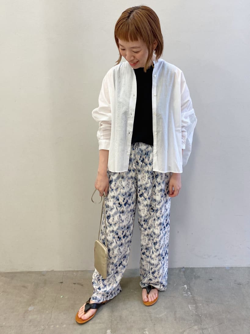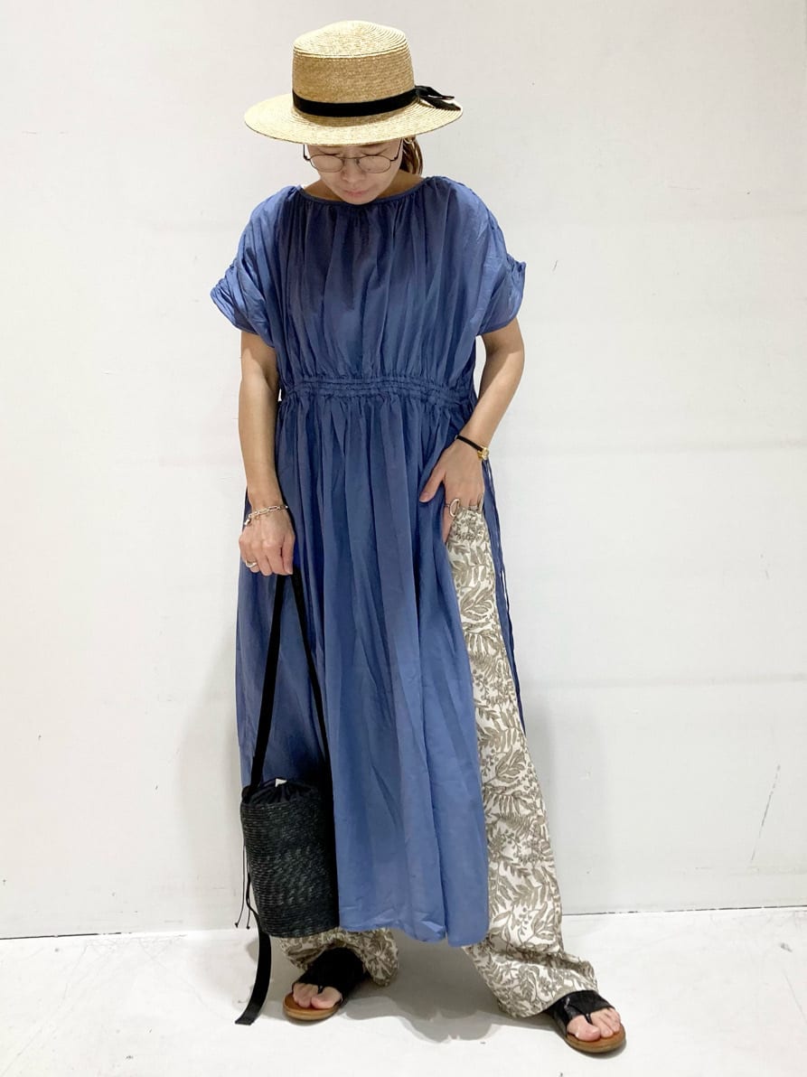 ブルーのワンピースと、ホワイトをベースにした柄物ワイドパンツで清涼感のあるコーデに仕上がっています。