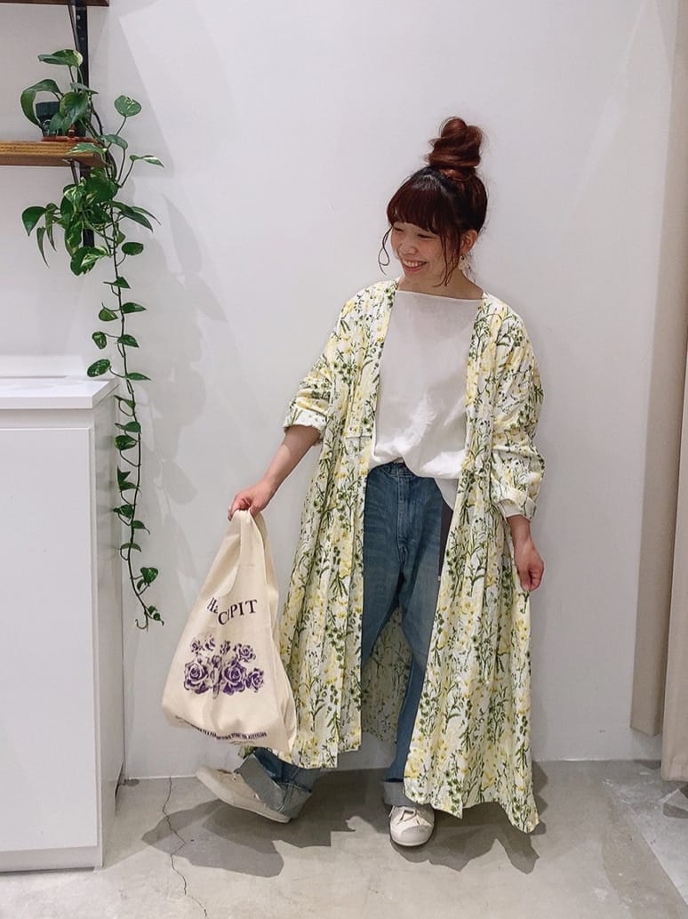 デニムワイドパンツと白のカットソーに花柄のワンピースを羽織ってカジュアルながらも女性らしさのあるコーデになっています。