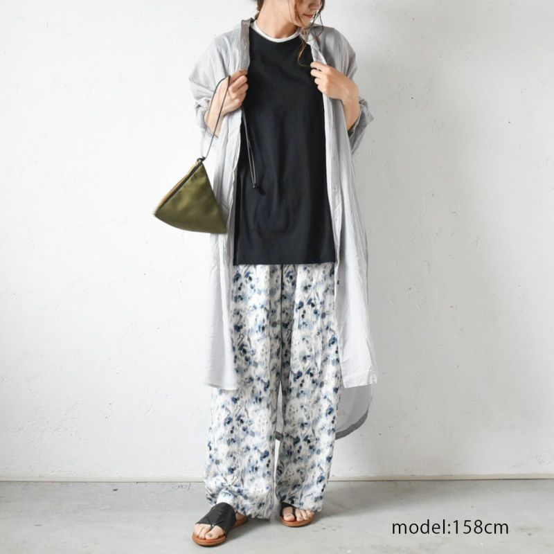 羽織りのシャツチュニックは裾がラウンドになっていて、前後差のあるデザインがワイドパンツの羽織りにぴったり。