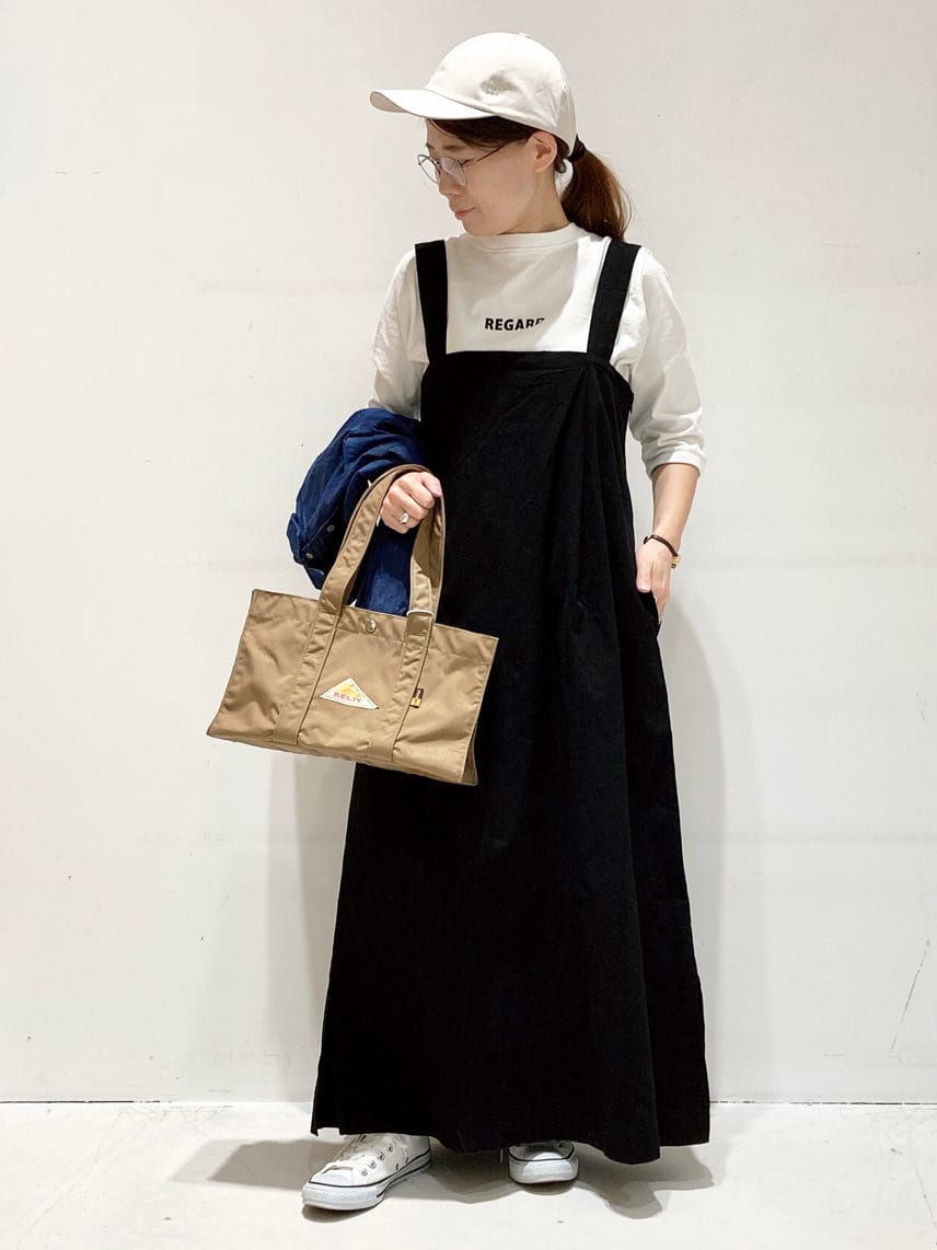 ジャンパースカートのインナーにシンプルなロゴTシャツを合わせたコーディネート。