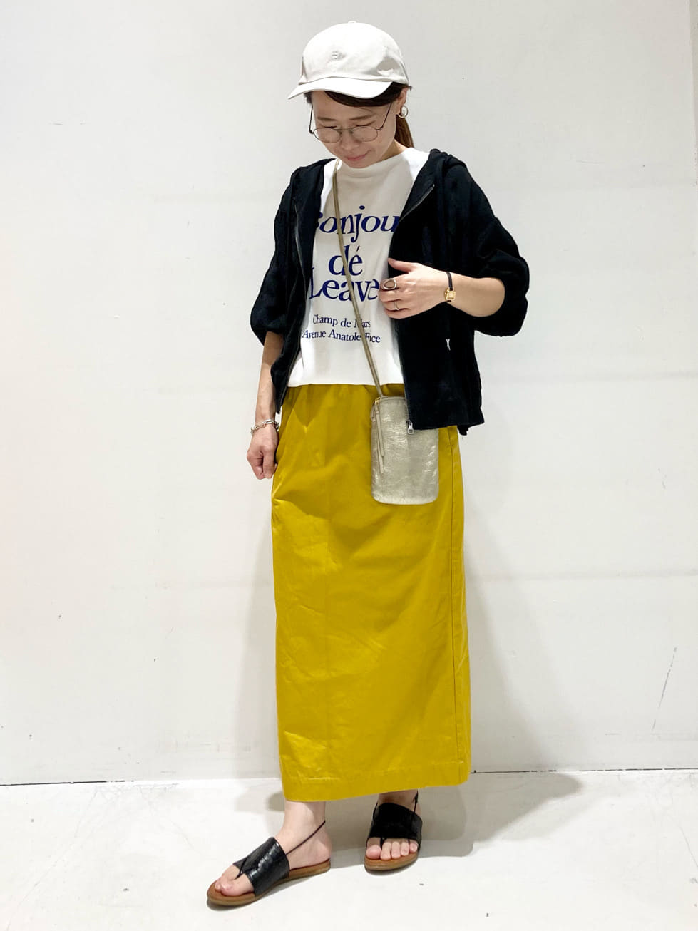 主張強めのロゴTシャツにスッキリしたロングスカートを合わせた大人のカジュアルスタイル。