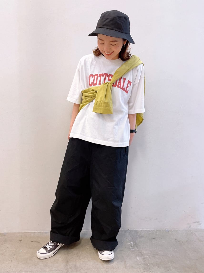 元気なイメージを与えてくれるカラーロゴの白Tシャツにリラックスシルエットのパンツで、アクティブシーンにぴったりなコーデ。
