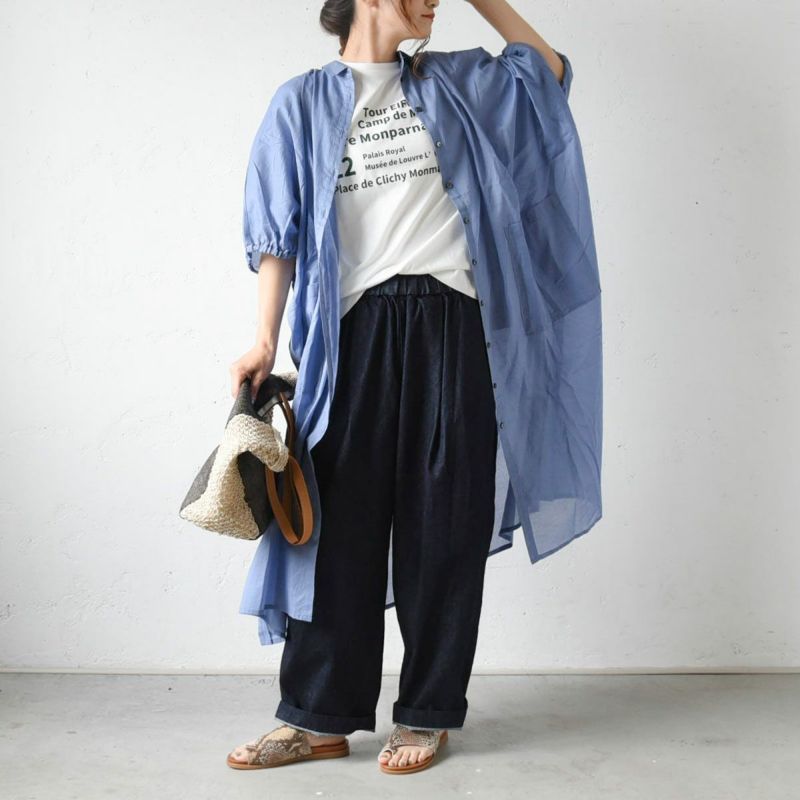 シンプルロゴTシャツ×ワイドパンツ×シャツの大人リラックスコーデ