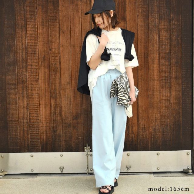 ロゴの一部が無地の箔プリントになっていて、フォントや字体の異なるロゴがスタイリッシュな印象を与えるTシャツに、薄めカラーのワイドパンツがさわやかなコーデ。