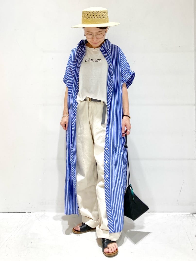 Tシャツにワイドパンツのリラックスしたスタイルに、ストライプシャツを合わせるて程よいカッチリ感がプラスされたコーデです。