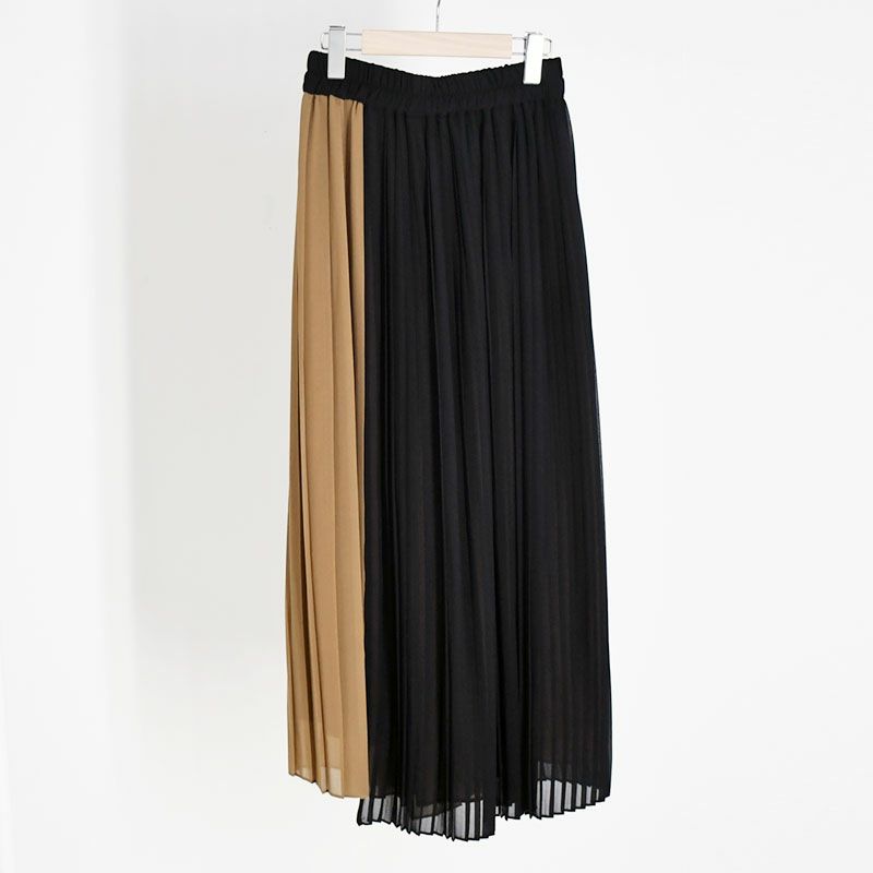 大人っぽいブラックとベージュの切り替えプリーツスカートに、カジュアルなカレッジロゴTシャツがキチンとしすぎない抜け感を出してくれます。