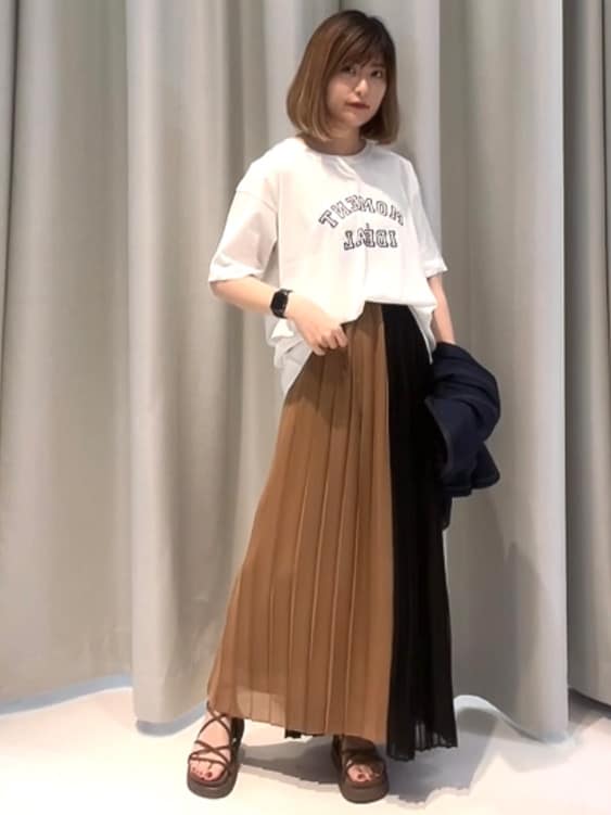 流行りのカレッジロゴTシャツにカラーが切り替えられたプリーツスカートを合わせて、抜け感のある大人コーデ。
