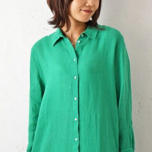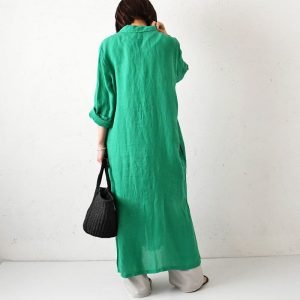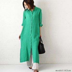 リネン100%のシンプルなシャツワンピースですが、グリーンにするだけでエレガントな女性らしいイメージに仕上げてくれます。