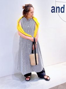 いつものワンピースに、明るいカラーをプラスするとスタイリングが新鮮になるのではないでしょうか。