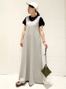 こちらは、ノースリーブワンピースとTシャツをレイヤードした、大人ナチュラルコーディネートです。