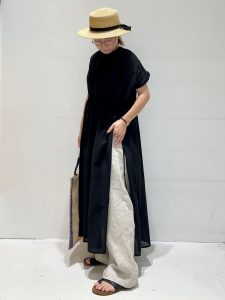 今回はとことんシンプルに、帽子やバッグ・サンダルもブラック系のカラーで統一。