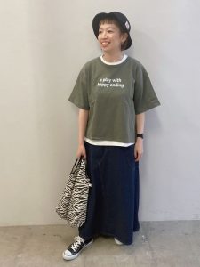 こちらは、ロゴT×スカートの王道コーデにアクセントをプラスしたコーディネート。