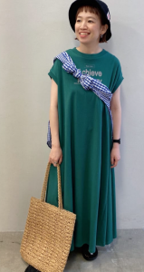 グリーンのワンピースには、ナチュラルなかごバッグが良く合います。