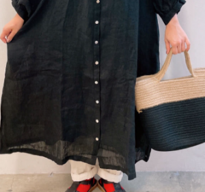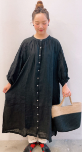 リネンのワンピースは、黒でもナチュラルでやわらかい雰囲気。