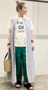 Tシャツとカラーパンツの上からさお羽織るだけで、今っぽいコーデが出来上がります。