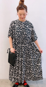 落ち着いたカラーの柄ワンピはシックな印象があり、大人の女性が着やすいアイテムです。
