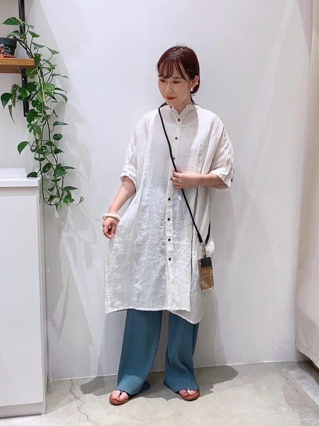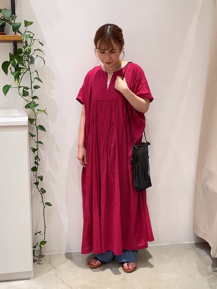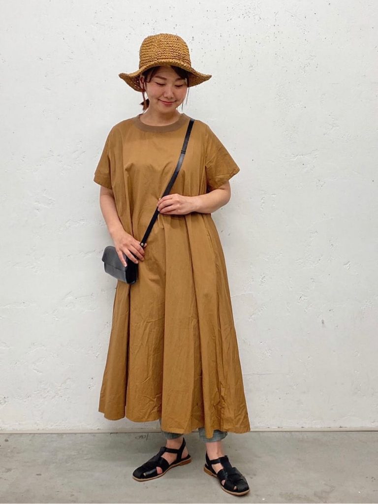 ワンピースはハリ感のあるタイプライター素材で、着心地も軽くお洗濯してもすぐに乾きやすいのが魅力。一枚でも充分可愛いですが、ワンピーススタイルを楽しみながらアクティブに動きたい時は、中にパンツをレイヤードするのがおすすめ。麦わら帽子など夏小物をプラスすれば、季節感のある華やかなコーデに仕上がります。