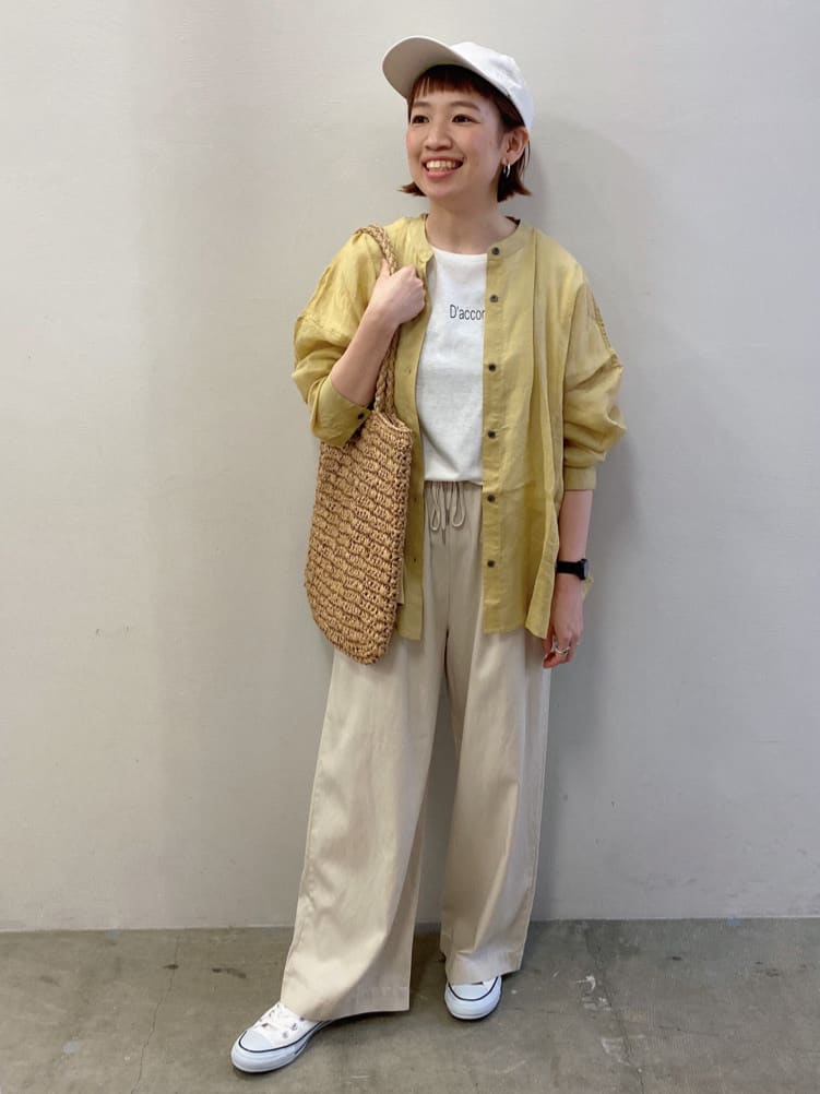 履き心地のよいイージーワイドパンツに、ロゴTとリネンシャツを合わせたコーデ。シャツはリネン100%素材でサラッとした素材感が夏にピッタリ。くすみイエローが品よく大人っぽさも演出してくれます。パンツは、ストンとした落ち感が魅力。ウエストもゴムなので旅行先で食べ過ぎてしまっても安心♡シワになりにくいテンセルが入っているので旅行先でもケアしやすく使い勝手◎