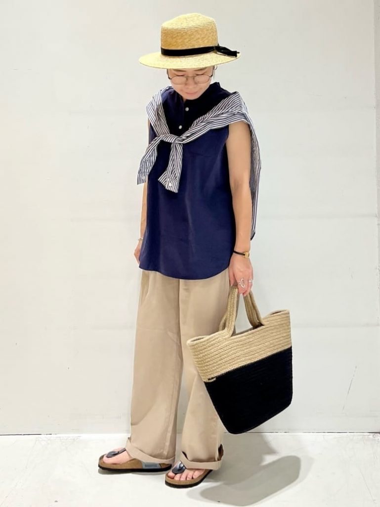 ネイビーのブラウスとベージュのパンツを合わせたコーデは、大人のきちんと感を演出するのにピッタリな配色。肩がけしたストライプシャツが、夏らしい爽やかな抜け感をプラスしてくれます。長袖シャツもカーディガン同様、冷房対策や、日除け対策でさっと羽織ることができるので旅行先に一枚持っておくと便利です。シワだけ気をつけましょう!