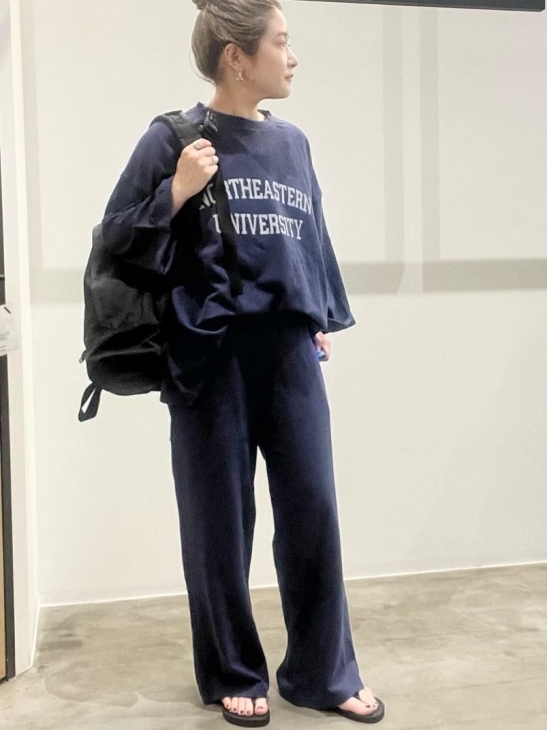 飛行機などの長距離移動におすすめなコットン100%のセットアップ。柔らかく、ストレッチ性もあるので着心地もストレスフリー。トップスとパンツを別々に使うこともでき、着回しにも便利に使えます。パジャマ感を回避するためには、ヘアスタイルに凝ってみたり華やかなアクセサーを身につけるのがポイントです。