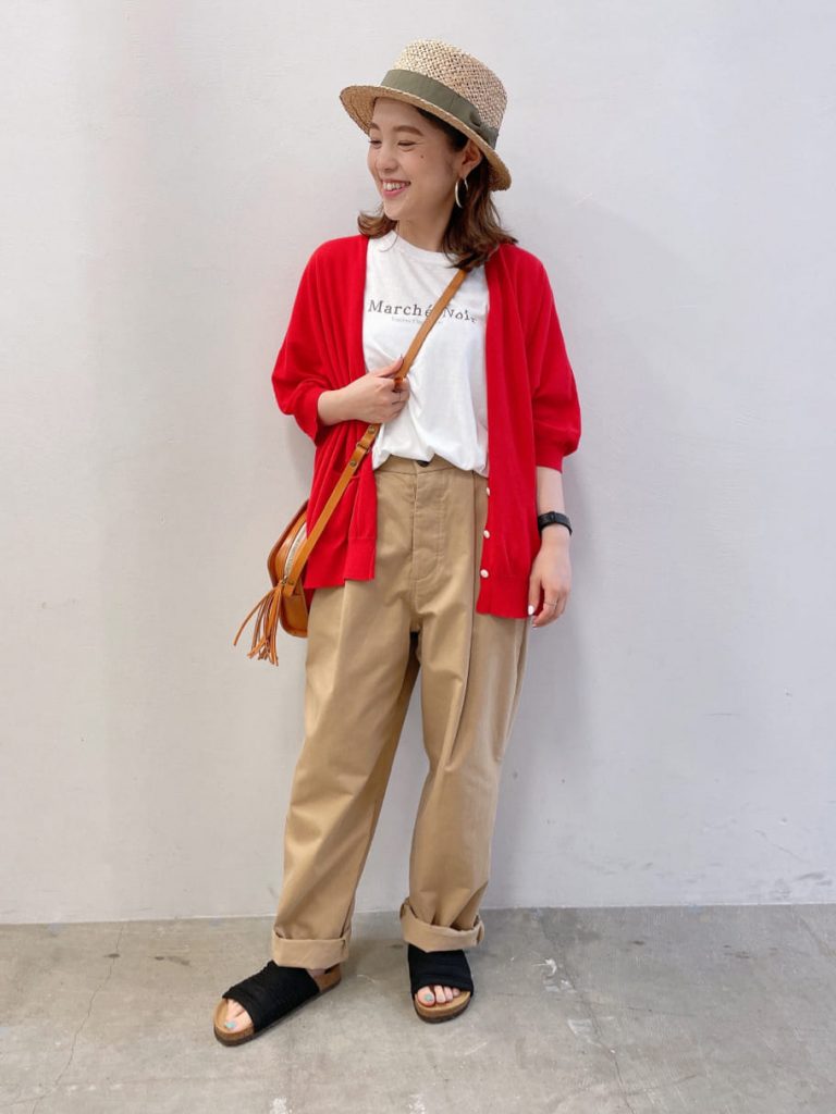 どのアイテムも着回しがしやすいベーシックなアイテムですが、赤のカーディガンのスパイスが効いて存在感のあるコーデに仕上がっています。カラーカーディガンは着回しもしやすく、シンプルコーデにもオシャレなアクセントを加えてくれるので一枚持っておくと便利なアイテム。素材はオールシーズン使いやすいコットン素材がおすすめです。