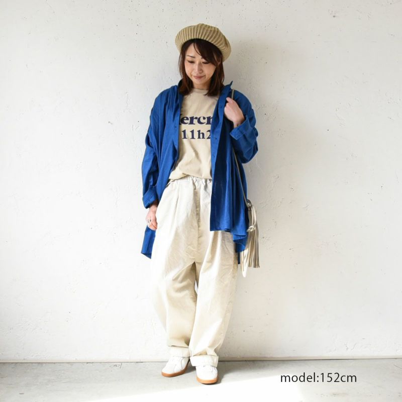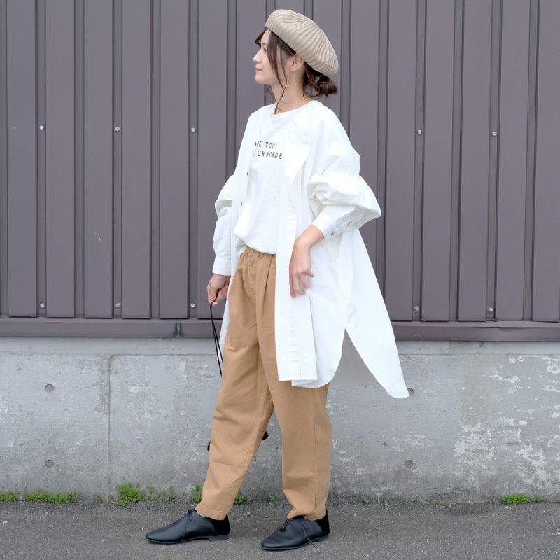 コットン×リネンブレンド素材を使ったチュニックシャツは、夏から秋の季節の変わり目のコーディネートに重宝してくれるトップス。シャツデザインの前開きタイプで羽織り物としても着回しが効くので、秋の始まりには気温調整にも役立ってくれるでしょう。ホワイトパンツとロゴTシャツを合わせた、爽やかな春のワントーンコーデ。エクリュスタイルに映える、キリっとしたブルーチュニックをプラスして、グッと存在感を高めたおしゃれに。ベレー帽をアクセントにして、大人可愛いカジュアルコーデができあがり。