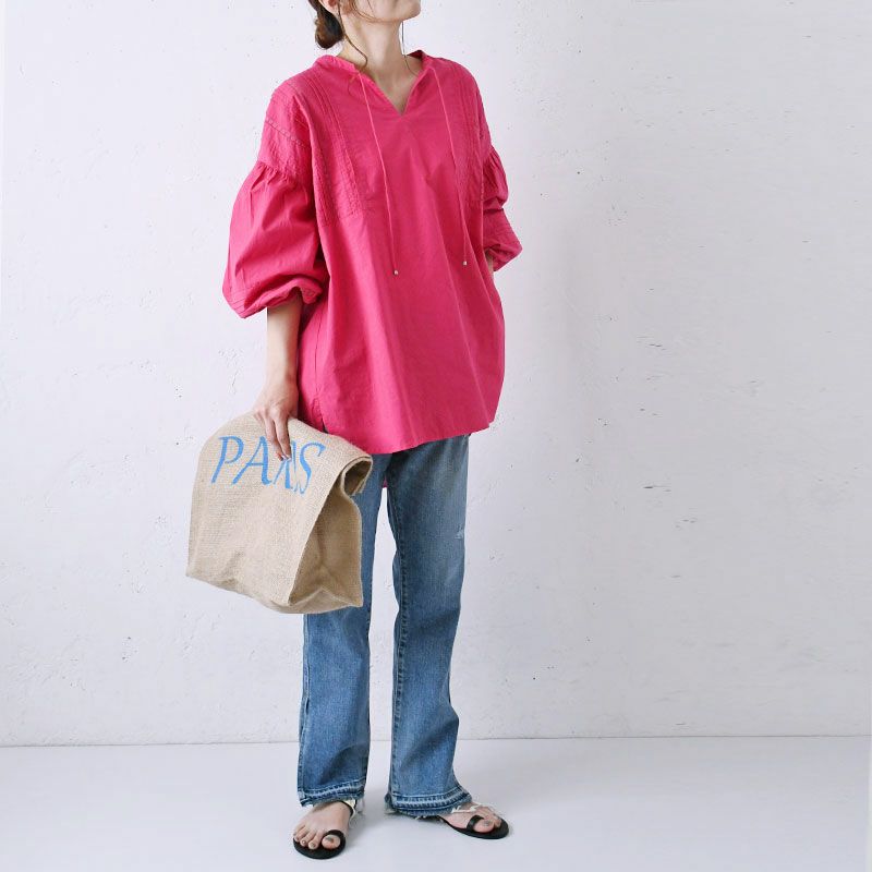 ボリューミーなアームデザインやポイントのレース使いによって、いつもの夏コーデを新鮮にブラッシュアップしてくれる主役級のチュニック。鮮やかなピンク色が存在感を後押しして、フレッシュな夏の着こなしを叶えてくれそう。おしゃれなチュニックを引き立てるように古着っぽいルックスのデニムパンツを合わせてカジュアルダウンすると、肩の力が抜けたおしゃれにシフトチェンジ。ロゴ入りのカゴバッグをアクセントアイテムにもって、夏らしい軽やかさを演出しましょう。