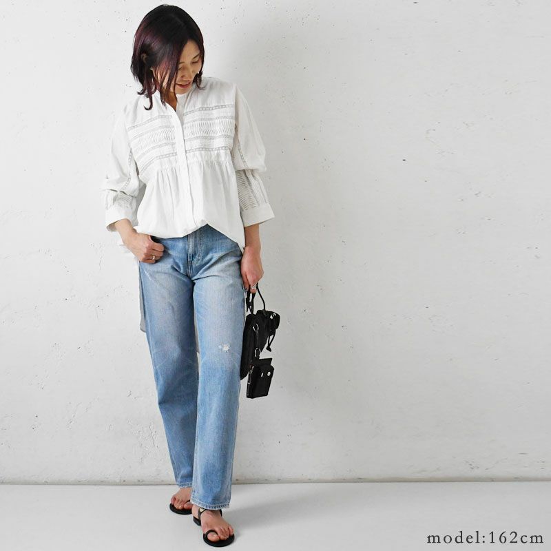 薄手でもしっかりとした素材感になっていて、季節の変わり目にちょうど良いシャツチュニック。レースの切り替えデザインがアクセントになり、そのままでもフェミニンなおしゃれを叶えてくれる優れもの。前後差のあるラウンドカットのチュニックを、フロントのみタックインした着こなしでこなれ感を発揮して。ダメージデニムを組み合わせたラフなスタイルで、気負わない大人カジュアルコーデを実現。小物を黒でリンクさせて、コーディネート全体に統一感をキャッチしたコーデができあがり。